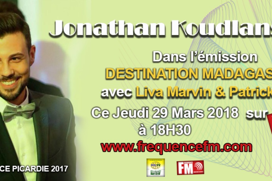 L'émission Destination Madagascar nous avons invite Mr Jonahthan Koudlanski ( MODÈLE ÉLÉGANCE PICARDIE 2017 ) pour nous parler de son parcours et ses projets. Emission animé par Liva et Patrick. Le Jeudi 29 Mars 2018 à 18H30 sur www.frequencefm.com Modèle Élégance France est un concours de mode, de beauté, d'élégance et de charisme masculin fondé en 2010 par Julien MEICHTRY-TRUNTZER et qui a pour but de donner l’opportunité à des jeunes hommes âgés de 17 ans à 29 ans et mesurant 1.72m minimum de pouvoir représenter leur région et aussi la......