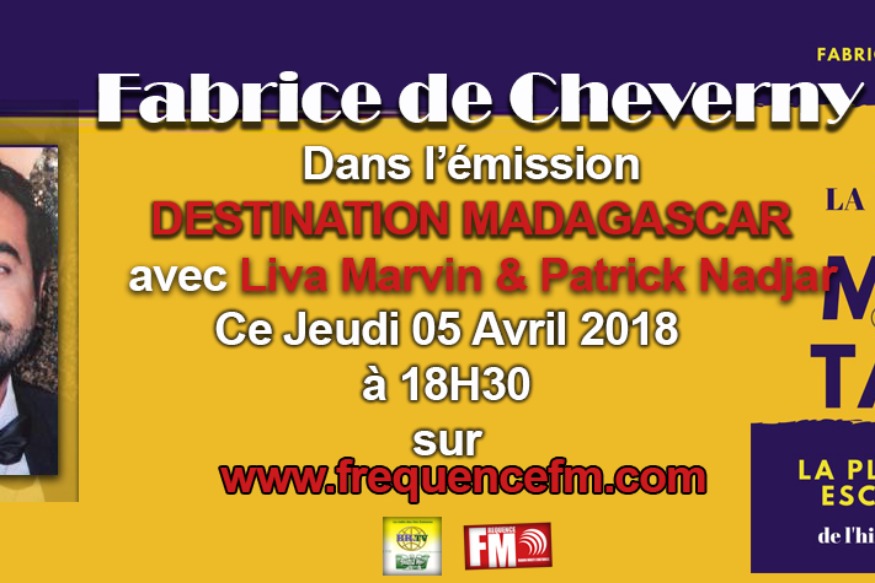 L'émission Destination Madagascar nous avons comme invité Mr Fabrice de Cheverny pour nous parler de son parcours, son livre, sa passion pour madagascar et ses projets. Emission animé par Liva et Patrick. Le Jeudi 05 Avril 2018 à 18H30 sur www.frequencefm.com