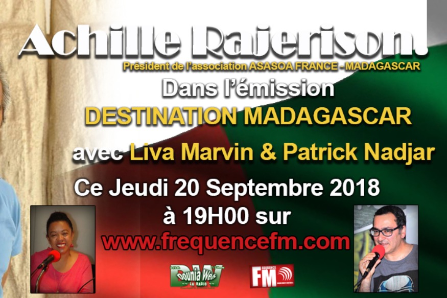 Ce jeudi à 19h00, l'équipe de destination Madagascar accueillera Mr Achille Rajerison - Présindent de l'association ASASAO FRANCE - Madagascar. Emission présente par Liva Marvin & Patrick Nadjar.