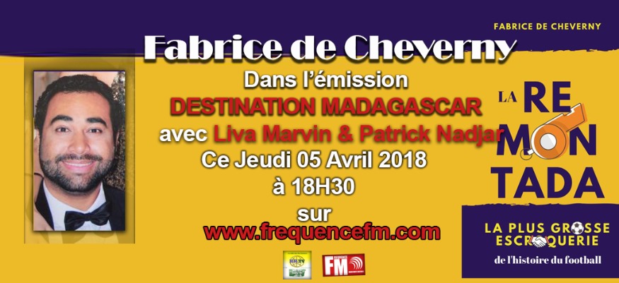 L'émission Destination Madagascar nous avons comme invité Mr Fabrice de Cheverny pour nous parler de son parcours, son livre, sa passion pour madagascar et ses projets. Emission animé par Liva et Patrick. Le Jeudi 05 Avril 2018 à 18H30 sur www.frequencefm.com