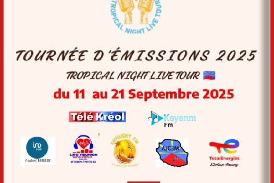 Le Tropical Night Live Tour est de retour pour une nouvelle édition qui s’annonce inoubliable. Pour sa 3ème saison, l’émission culte s’installe à Paris. le temps de deux week-ends, offrant au public une expérience unique faite de musique, d’interviews et de live acoustiques. Le rendez-vous est donné : 11, 12, 13 et 14 septembre 2025 au The Home Studio.18, 19, 20 et 21 septembre 2025 à l’Association UTR. Un programme riche, rythmé et 100 % en direct pour faire vibrer les auditeurs et spectateurs. Les émissions seront retransmises en direct, avec des horaires adaptés à Paris......