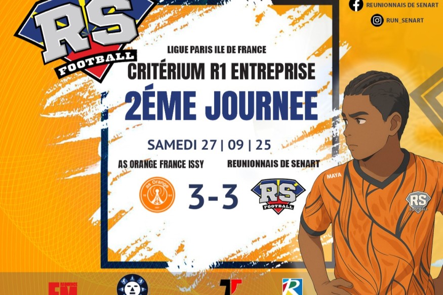 Critérium R1 Entreprise – 2ème Journée AS Orange France Issy 3 – 3 Réunionnais de Sénart Les Réunionnais de Sénart ont livré un match fou ce samedi, arrachant le nul face à l'AS Orange France Issy dans un scénario haletant. Un premier mi-temps spectaculaire Les Sénartais ouvrent le score grâce à El Habib , auteur d'un geste de grande classe : une frappe lointaine s'engage hors de la surface, qui lobe parfaitement le gardien et termine au fond des filets. Un mais somptueux qui lance idéalement le match. Quelques minutes plus tard, c'est au tour de Brice d'inscrire un but......