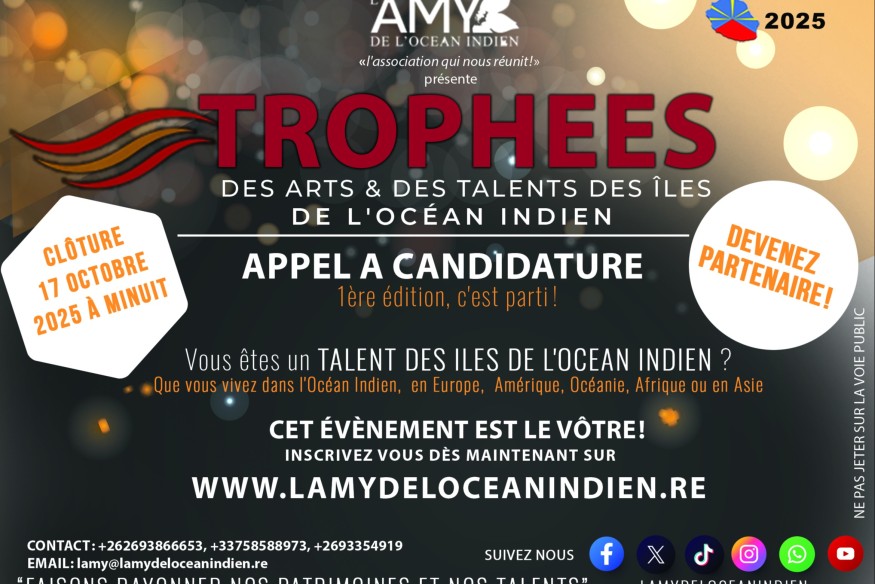 Et si on célébrait enfin ce que nos îles ont de plus beau : leurs talents, leurs histoires et leur créativité ?C’est exactement ce que propose L’AMY de l’Océan Indien avec la première édition des Trophées des Arts & des Talents des Îles de l’Océan Indien. Cet événement inédit veut rassembler tous les talents — artistes, artisans, musiciens, danseurs, écrivains, sportifs, créateurs, entrepreneurs, passionnés… — qu’ils vivent dans l’Océan Indien ou aux quatre coins du monde.Parce que, peu importe où......