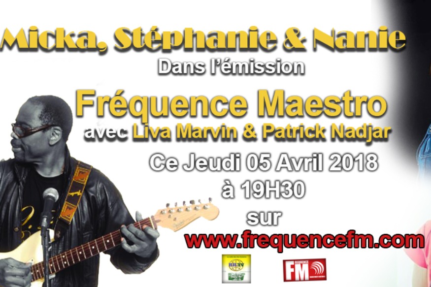 L'émission Fréquence Maestro nous avons comme invités plusieurs artistes : Sam, Micka, Stéphanie & Nanie pour nous parler de leurs parcours et leurs projets. Emission animés par Liva et Patrick. Le Jeudi 29 Mars 2018 à 19H30 sur www.frequencefm.com Sam & Micka NANIE ...
