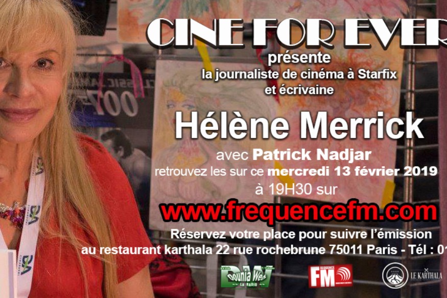 Patrick Nadjar présente Cine Forever n°89, le mercredi 13 fevrier 2019 à partir de 19h30. Nous aurons le plaisir de recevoir Hélène MERRICK, La fille de Starfix et de Cine News et aussi écrivaine. Vous pouvez assister à l'émission au restaurant Karthala en réservant un table et découvrir les plats de l'océan indien https://lekarthala.com/reservation/Une émission Ciné Forever à ne pas rater qui sera diffusée sur www.frequencefm.com et sur FaceBook live. ...