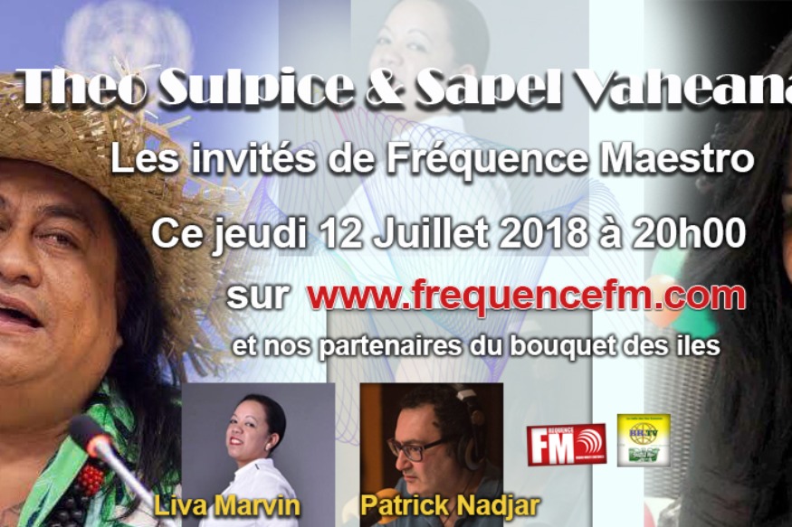 Dans l'émission Fréquence Mastro, ce jeudi 12 juillet 2018 à 20h00 avec Patrick et Liva seront avec leurs invités : le Chanteur de la Polynésie française Theo Sulpice avec sa chanteuse Sapel VaheanaRestez connecté et suivez nos actualités sur frequencefm.com et sur facebook live. ...
