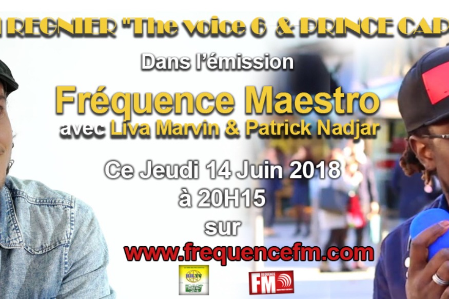 Dans l'émission Fréquence Maestro, nous accueillions Mr ROMAIN REGNIER "The voice 6 " et PRINCE CAPUCINO . Ils viendront nous parler de leurs parcours et des projets futurs. Une émission de Fréquence Maestro à ne pas rater qui sera diffusée sur www.frequencefm.com et sur FaceBook live....