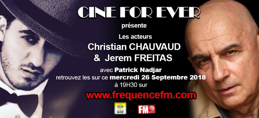 Nous aurons le plaisir de recevoir Christian CHAUVAUD , acteur de cinema (pres de 35 films avec m.Jean-Pierre Mocky) et de théatre et Jerem Freitas , metteur en scène et acteur de la piéce Cher Parrain. Une émission Ciné Forever à ne pas rater qui sera diffusée sur www.frequencefm.com et sur FaceBook live.