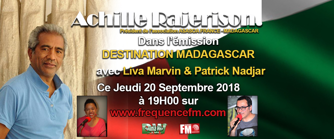 Ce jeudi à 19h00, l'équipe de destination Madagascar accueillera Mr Achille Rajerison - Présindent de l'association ASASAO FRANCE - Madagascar. Emission présente par Liva Marvin & Patrick Nadjar.
